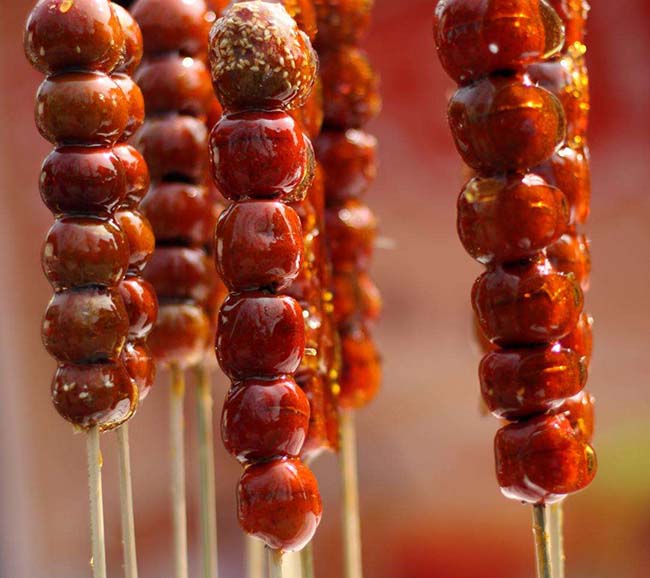冰糖葫蘆又叫糖葫蘆,在天津又稱糖墩兒,在安徽鳳陽叫作糖球。冰糖葫蘆是中國傳統(tǒng)小吃,它是將野果用竹簽串成串后蘸上麥芽糖稀,糖稀遇風迅速變硬。北方冬天常見的小吃,一般用山楂串成,糖稀凍硬,吃起來又酸又甜,還很冰。