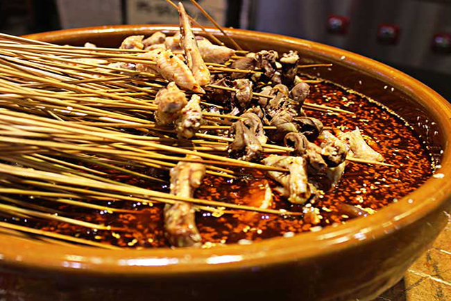 缽缽雞有著深厚的歷史淵源。一聽其名,就覺得很新奇,“缽缽”其實就是瓦罐,缽外面是畫著紅黃相間的瓷質龍紋,缽內盛放配以麻辣為主的佐料,菜品在特珠殊加工后用簽串制,晾冷浸于各種口味的佐料中,食用時自取自食,除味道悠長外更添情趣盎然。缽缽雞發展到今天,已經是葷素搭配,多元素搭配,在飲食口味上,麻辣清淡皆有。