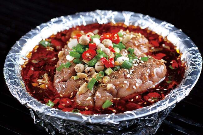 烤腦花是重慶地區(qū)的一道傳統(tǒng)特色小吃,采用豬腦子,拌之以海椒末、花椒粉以及其他佐料,火烤而成。氣味醇厚,入口綿軟,香而不膩,油而不肥。是到 旅游時切不可遺漏的一道小吃。