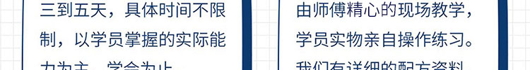 • 教學優勢: 手把手技術指導 真材實料操作 不控制原料設備 配方公開 技術支持與咨詢 隨到隨學 名師團隊指導 8年專注餐飲教育 學員遍布100+城市 不控制任何原料及設備